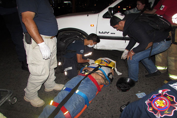 Un hombre en aparente estado de ebriedad que viajaba en su motocicleta a exceso de velocidad resulto con golpes de consideración al impactarse contra una camioneta, según testigos el herido jugaba carreras contra otra unidad de dos ruedas e intento pasarse la luz roja del semáforo.