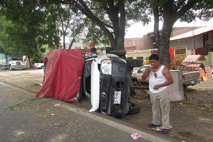 Varias contusiones sufrió un alcoholizado conductor cuando su camioneta volcó y consecutivamente se estrelló contra un árbol ubicado a la orilla del tramo carretero Tangancícuaro-Zamora, a la altura del kilómetro 130, cerca de la estación de combustible "Vigar".