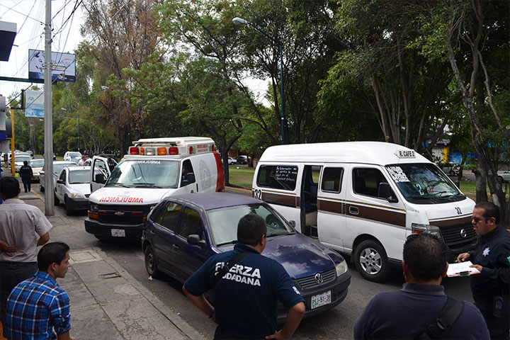 Un choque de una patrulla de la Fuerza Ciudadana (FC) contra una combi de la Ruta Café 2 dejó solamente daños materiales y varios pasajeros, además del chofer del transporte público, valorados médicamente, según se supo durante el trabajo reporteril.