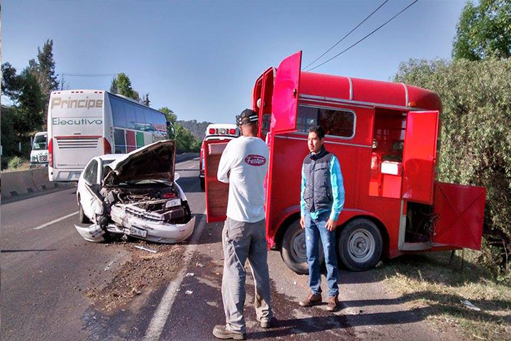 El choque de un automóvil contra un remolque, el cual transportaba dos caballos, ocasionó daños materiales y caos vehicular sobre el tramo carretero Morelia-Pátzcuaro, incidente en el que por fortuna no hubo lesionados. Paramédicos y bomberos de Protección Civil Estatal (PCE) acudieron al lugar para revisar la salud de los tripulantes, así como de los animales.