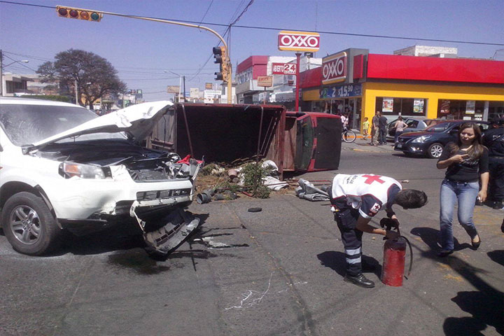 El choque volcadura entre dos camionetas arrojo un saldo de dos personas lesionadas y daños materiales por varios miles de pesos, este accidente movilizó a los cuerpos de emergencia, policíacos, así como de Bomberos Municipales, quienes hicieron limpia del pavimento, toda vez que hubo derramamiento de combustible.