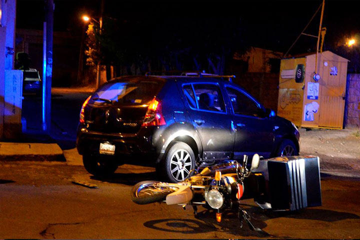 Solamente daños materiales dejó como saldo un choque entre una motocicleta de la empresa Domino's Pizza y un automóvil particular, registrado en las inmediaciones de la colonia Félix Ireta, de esta capital, informaron las autoridades policiales.