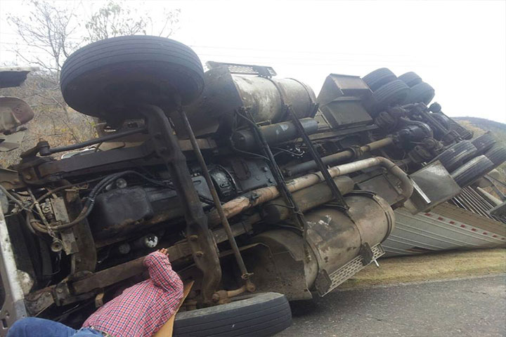 Un tráiler volcó al llegar a una curva de la carretera Villa Madero-Carácuaro, justo entre las comunidades de Las Cocinas y La Cadena, correspondientes a este municipio, incidente que únicamente dejó daños materiales.