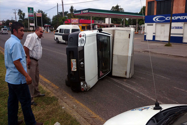 NOTICIAS 15/02/2015Aparatosa volcadura deja solo daños materiales La tarde de este domingo se registró un aparatoso accidente, donde una camioneta de mensajería volcó tras chocar contra un taxi en las inmediaciones del entronque "Las Adelitas", en esta ciudad portuaria, por fortuna no se reportaron lesionados, no víctimas que lamentar.
