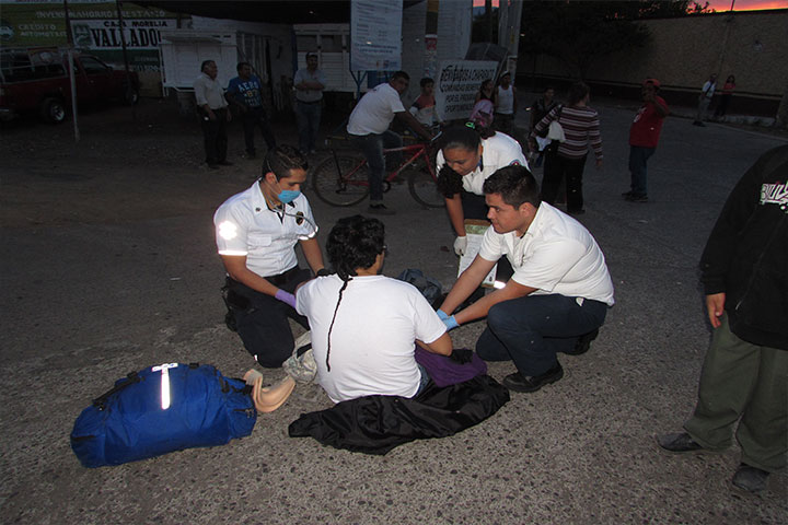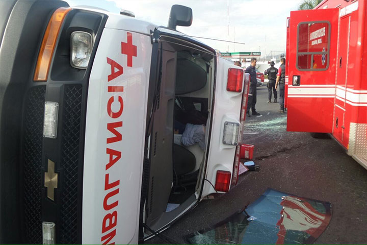 Tras el choque - volcadura de una ambulancia de la Cruz Roja (CR) quedaron malheridos cuatro paramédicos cobre el entronque de la Avenida Chiapas y Calzada Juárez, en esta ciudad de Uruapan.