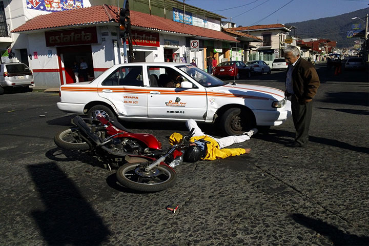 Una persona que viajaba a bordo de una motocicleta y se desplazaba a gran velocidad sobre la calle de Francisco Villa, resultó prácticamente ileso luego de que se impactó de lleno contra el costado derecho de un auto de alquiler y salir volando por los aires.