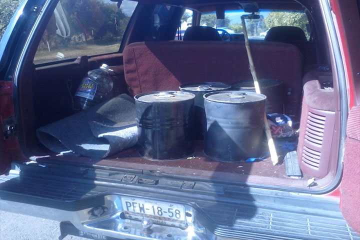 Sobre el tramo carretero Uruapan-Los Reyes, dos ocupantes de una camioneta fueron revisados por elementos de la Secretaría de la Defensa Nacional (Sedena), quienes les hallaron 100 litros de un precursor químico para elaborar droga sintética.