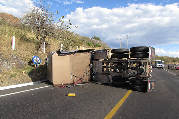 Aparentemente una falla mecánica ocasionó la volcadura de un tráiler aguacatero sobre el tramo carretero Zamora-Carapan, a la altura de la curva denominada Los Laureles, donde resultó herido el conductor, mismo que fue auxiliado por los cuerpos de rescate.
