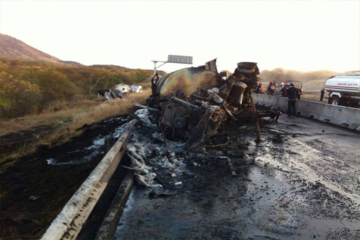 Luego de que una vaca se atravesara en la autopista Siglo 21, el chofer de una pipa que iba cargada con varios litros de combustóleo la arrolló accidentalmente, perdió el control de la unidad, la cual volcó y se incendió; situación que movilizó a los cuerpos de bomberos de este municipio de Múgica y de Apatzingán, quienes tardaron más de una hora en apagar las llamas, todo esto generó un fuerte embotellamiento en el tramo carretero U... Ver más...