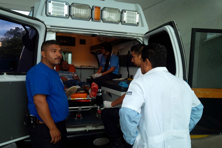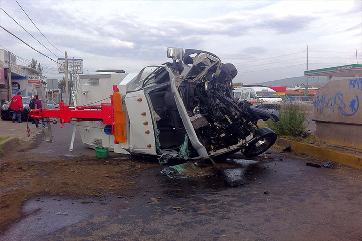 Los ocupantes de una grúa de "Auxilio Vial de México del Bajío" resultaron gravemente heridos cuando el mencionado vehículo se estampó contra una de las protecciones de concreto del puente salida a Quiroga y posteriormente volcó sobre la lateral de la avenida Madero Poniente.