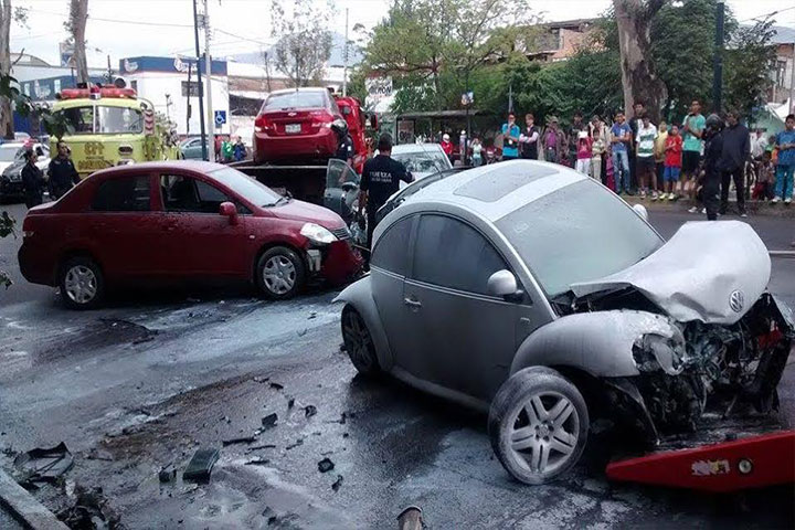 Un automóvil se incendió al chocar contra otra unidad motriz, incidente que ocasionó una carambola vehicular que dejó tres personas lesionadas sobre la avenida Madero Poniente, en la curva ubicada a la altura de la colonia Unión Popular Solidaria.