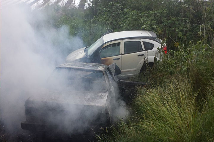 El encontronazo entre un auto y una camioneta dejó al menos tres personas heridas y daños materiales por varios miles de pesos, uno de los automotores se incendió y ello provocó que los cuerpos de emergencia así como de los traga humo se trasladaran al lugar para sofocar el fuego que amenazaba con extenderse al otro vehículo.