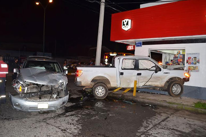 Tres lesionados, asà como daños materiales por varios miles de pesos, fue el saldo de un encontronazo entre dos camionetas, una de las cuales terminó estrellándose en un negocio expendedor de cervezas, donde se metió hasta el mostrador, según lo constatado durante el trabajo reporteril.