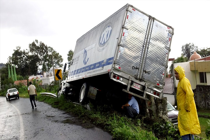 Un camión tipo caja refrigerante que se dirigía a esta ciudad, a punto estuvo de volcarse en la curva frente al hotel Pie de la Sierra, en la salida a Paracho; derribó parcialmente una barda de tabique y la malla ciclónica en el fraccionamiento El Mirador.