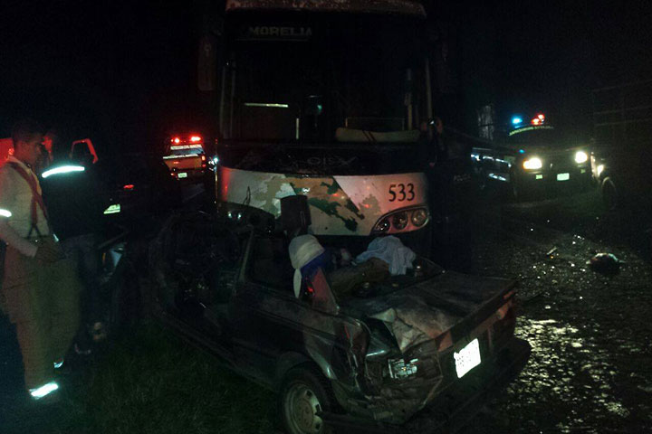 Un matrimonio y sus dos pequeños hijos se debaten entre la vida y la muerte, después de que el automóvil donde viajaban se estrellara de frente contra un autobús de pasajeros que estaba estacionado a un lado de la carretera Zamora-Carapan, en esta municipalidad.