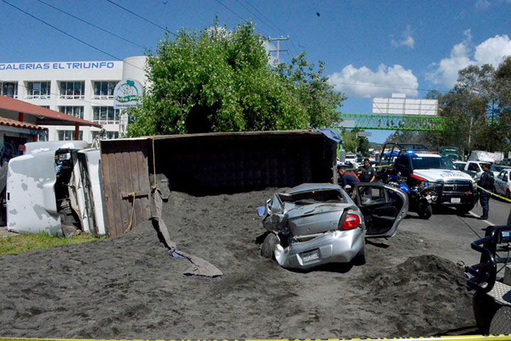 Un camión tipo volteo que iba cargado con varias toneladas de arena embistió a dos automóviles que estaban parados en un semáforo; hecho que dejó cinco lesionados y cuantiosos daños materiales, según informaron las corporaciones policiales que atendieron la emergencia, mismas que capturaron al chofer de la pesada unidad.