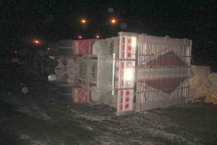 La noche del jueves pasado se registró un aparatoso accidente en la carretera Zamora-Tangancícuaro, justo frente a las instalaciones del mercado de Abastos de Canindo, donde un camión cargado con varias toneladas de fruta volcó en plena carretera, lo que provocó el cierre parcial de la rúa.