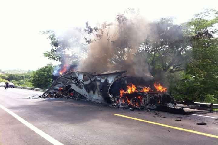 Un cargamento de leche de un tráiler de la empresa Lala terminó reducido a cenizas, después de que las balatas del tractocamión se quemaran y esto provocara el incendio del contenedor de la pesada unidad, sin que por fortuna hubiera víctimas humanas que lamentar.