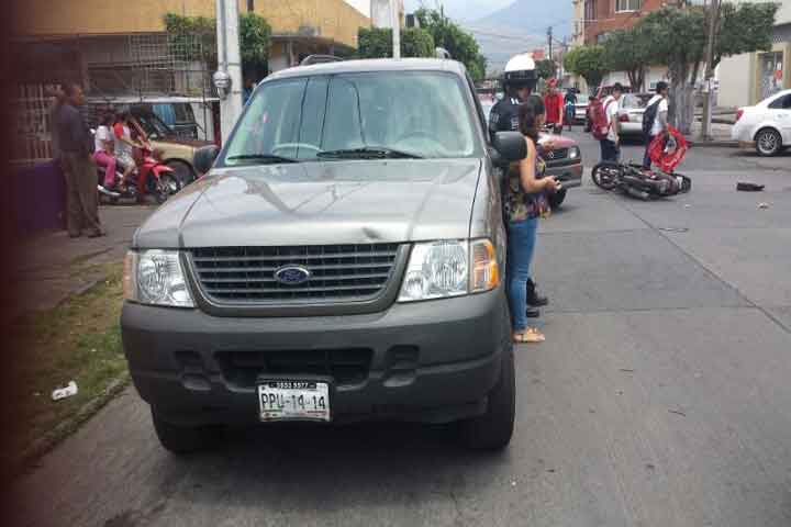 El choque entre una motocicleta y una camioneta dejo como saldo a un trabajador de Soriana herido, quien tuvo que ser canalizado a la sala de urgencias del Seguro Social.