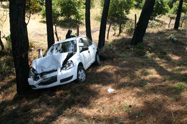 Una pareja que viajaba a bordo de un automóvil que pretendía rebasar un tráiler, resultó con golpes leves, luego de que al tratar de reincorporarse a su carril, chocó contra las llantas del pesado camión, se salió del camino, volcó y terminó impactándose contra la base de un árbol, a la altura de la desviación a San Ángel Zurumucapio, de la carretera libre a Tingambato.