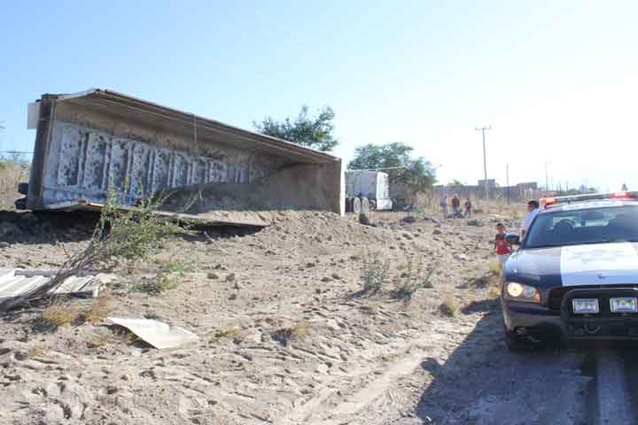 El chofer de un tráiler cargado con varias toneladas de arena, volcó esta mañana en la salida a Cojumatlán, frente a la Escuela Preparatoria, quien resultó lesionado al igual que se acompañante, quienes fueron hospitalizados.