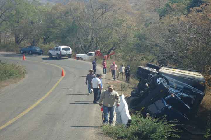 Un tráiler propiedad de la agrupación musical "Beto y sus Canarios" volcó en la carretera Tiquicheo-Huetamo, en esta municipalidad, con un saldo de cuantiosos daños materiales, pues trasladaba todos los instrumentos de la banda.