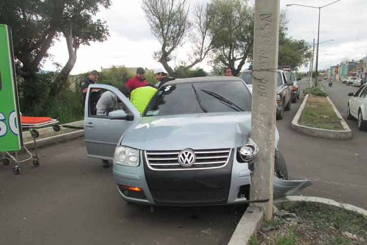 El descuido del conductor de un automóvil provocó que chocará contra un poste de concreto, cuando al parecer se distrajo al tratar de levantar su celular, que se le cayó al suelo de su unidad estando ésta en marcha, según dieron a conocieron las autoridades de Tránsito Municipal; tras lo sucedido hubo una lesionada.
