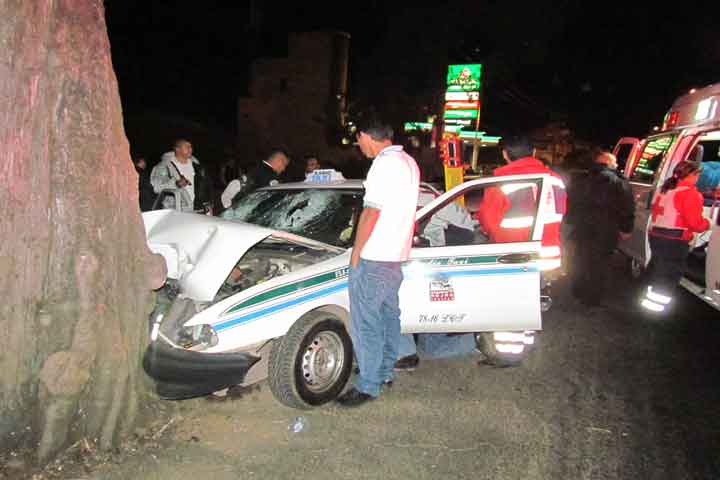 Un taxista y su pasajera resultaron lesionados, cuando el vehÃculo de alquiler en el que se trasladaban se salió de control y chocó contra un árbol, en la Calzada Benito Juárez, de esta ciudad.