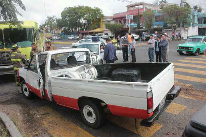 Dos trabajadores de la empresa ServiGas resultaron lesionados al igual que otro joven en el choque de una camioneta y un auto compacto sobre la avenida Decima y la calle Tepeyac pertenecientes a la colonia Jardines de Guadalupe.