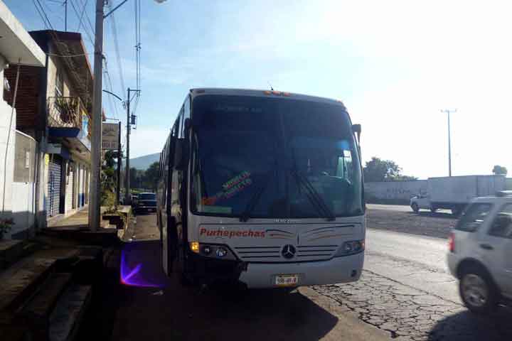 Un autobús de pasajeros embistió a un automóvil por alcance, cuando ambos eran tripulados en el mismo sentido sobre la carretera libre Uruapan - Pátzcuaro, por fortuna sin lesionados y sólo daños materiales.