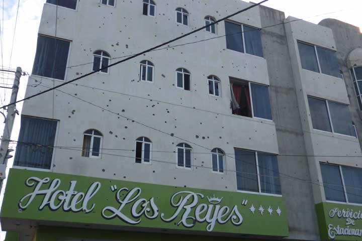 Al menos una veintena de desconocidos rafagueó el hotel donde se hospedan los efectivos de la Policía Federal (PF), en Los Reyes, a donde también arrojaron cinco granadas de fragmentación, tras el atentado extraoficialmente se supo que hubo un agente herido, sin que por fortuna hubiera bajas.