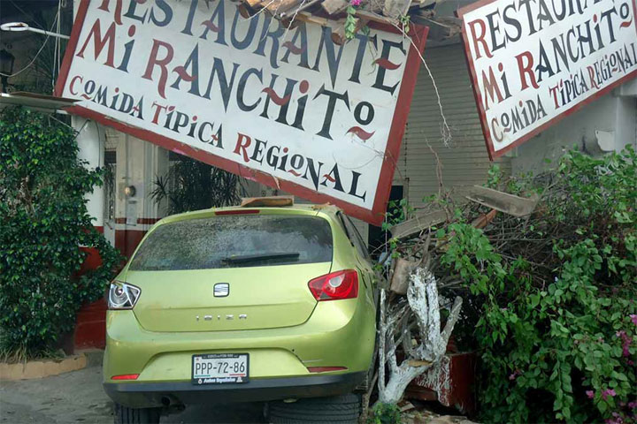 El accidente fue al filo de las 06:00 horas de este martes, frente al jardín principal de Huetamo, donde quedó destrozado el Portal Allende, justo frente al restaurante Mi Ranchito.