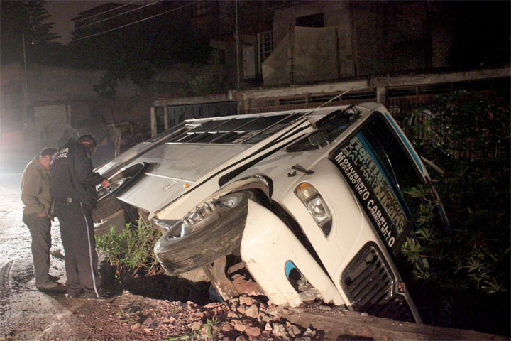Aproximadamente a las 04:40 horas de este jueves un camión del transporte público, sin pasaje, cayó accidentalmente a un pequeño canal de aguas negras ubicado en la colonia El Arquito, en la Tenencia Morelos.