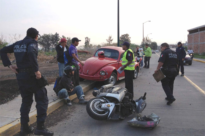 Dos trabajadores de la construcción que viajaban a bordo de una motocicleta fueron embestidos por vehículo y debido al impacto terminaron malheridos sobre el asfalto, así que los paramédicos los trasladaron de emergencia a la clínica 4 del Seguro Social y la Policía Turística detuvo al presunto responsable.