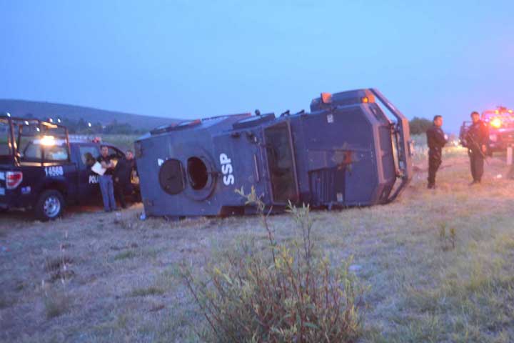 Elementos de la Policía Federal (PF), a bordo de un vehículo blindado "Rinoceronte", se accidentaron en la Autopista de Occidente y resultaron lesionados tres de los oficiales, uno de ellos tenía graves heridas y fue atendido por paramédicos de Protección Civil Estatal (PCE), quienes lo trasladaron vía aérea a un hospital privado de Morelia.