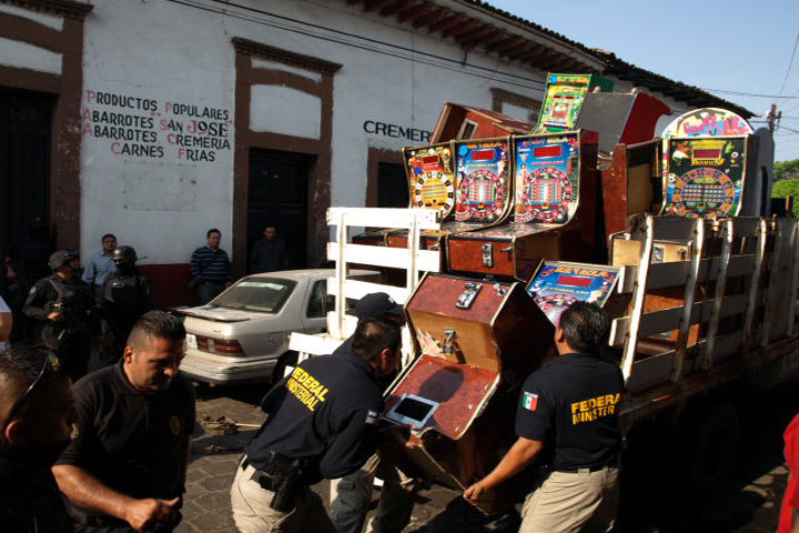 En un cateo realizado en un inmueble de Tacámbaro, el agente del Ministerio Público de la Federación con apoyo de policías federales ministeriales y elementos del Grupo de Operaciones Especiales (GOE), decomisó 20 máquinas tragamonedas.
