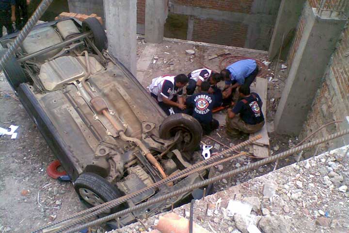 Por fortuna dos jóvenes salvaron sus vidas, luego de que en el vehículo en que viajaban cayeran a un barranco de entre seis y siete metros de profundidad, deteniendo el vuelo en una obra en construcción y todo quedó en susto pues, resultaron con lesiones leves.