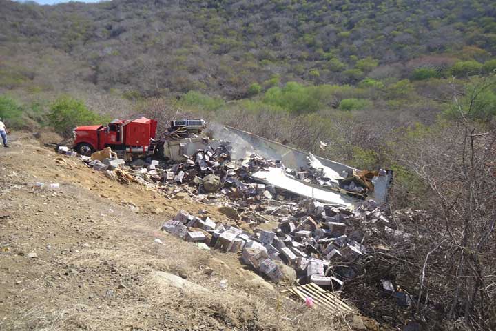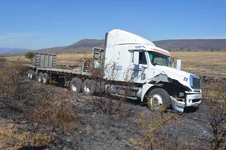 Un tráiler cargado con 36 toneladas de melón se precipitó a un barranco de aproximadamente 15 metros de profundidad, el cual se ubica a un lado de la carretera estatal Huetamo-Churumuco; el conductor abandonó el transporte y se desconoce si sufrió o no alguna lesión.