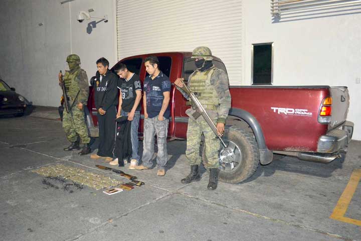 Tres jóvenes y presuntos delincuentes fueron detenidos por elementos de la Quinta Compañía de Infantería No Encuadrada (5ta CINE), adscritos a la 21 Zona Militar, a quienes les aseguraron varios kilos de mariguana, un arma larga y una corta, así como 15 objetos metálicos hechos a manera de "estrellas", utilizados para ponchar llantas durante persecuciones.
