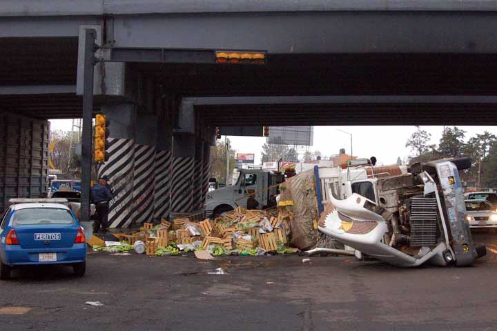 Un camión que trasladaba 25 toneladas de plátano, procedente de Tierra Caliente, volcó en la avenida Morelos Norte, de Morelia, justo debajo del puente vehicular del Periférico Revolución.