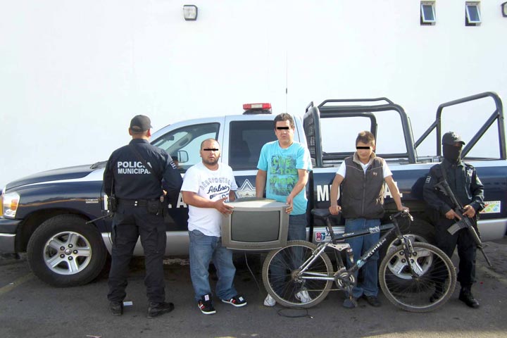 La madrugada de este domingo elementos de la Dirección de Seguridad Pública lograron la captura de tres presuntos delincuentes, en los momentos que salían de una paletería en poder de una bicicleta y una televisión.
