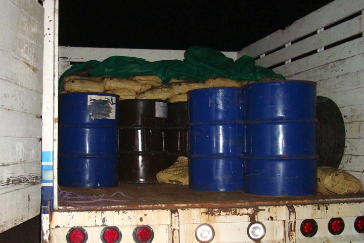 Dos mil 600 litros de disolvente y diversos químicos, así como mil kilos de sosa caústica, todo lo cual aparentemente sería empleado para la elaboración de droga sintética, fue decomisado por efectivos de la Secretaría de la Defensa Nacional, dentro de dos vehículos que hallaron abandonados, en un patrullaje contra el crimen, realizado en Apatzingán.