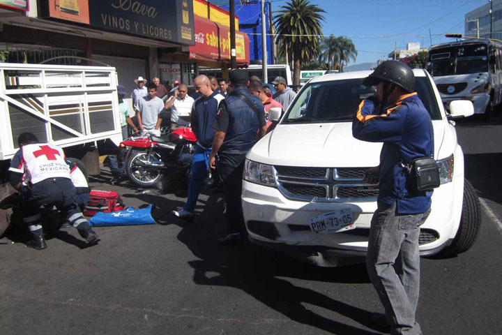 El accidente se registró al filo de las 13:25 horas del pasado jueves, sobre la avenida 5 de Mayo casi esquina con Virrey de Mendoza, lugar donde se dieron cita los elementos de la Policía y Tránsito Municipal, para tomar conocimiento de los hechos.