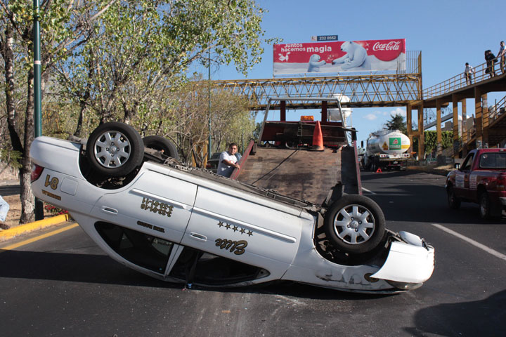 En las inmediaciones de la colonia Lomas de Morelia, un taxi terminó volcado y su conductor lesionado, luego de que éste intentó rebasar una pipa de Petróleos Mexicanos (Pemex) sobre el Periférico Revolución.