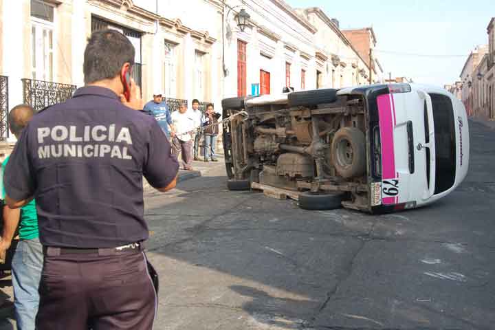 Solo daños materiales dejó el choque de una camioneta contra una combi del servicio público, misma que se volcó en pleno Centro Histórico, de esta ciudad, sin que afortunadamente llevara pasajeros.