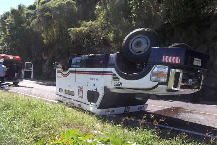 Personal de Protección Civil de local auxilió a tres custodios, quienes sufrieron múltiples lesiones luego de que su camión transportador de valores sufrió una falla mecánica y volcó sobre el tramo carretero Atlacomulco-Morelia.