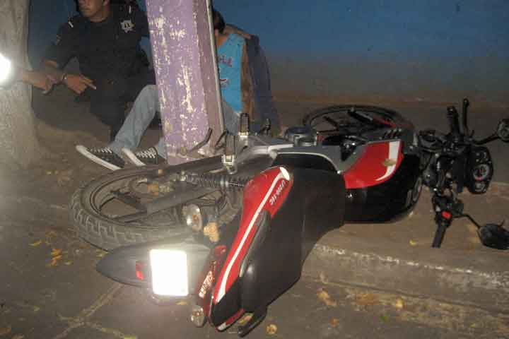 Aparentemente ebrios, dos ocupantes de una motocicleta sufrieron varias lesiones al estrellarse contra un poste de concreto ubicado en la avenida Del Árbol, justo al exterior del Colegio de Michoacán.