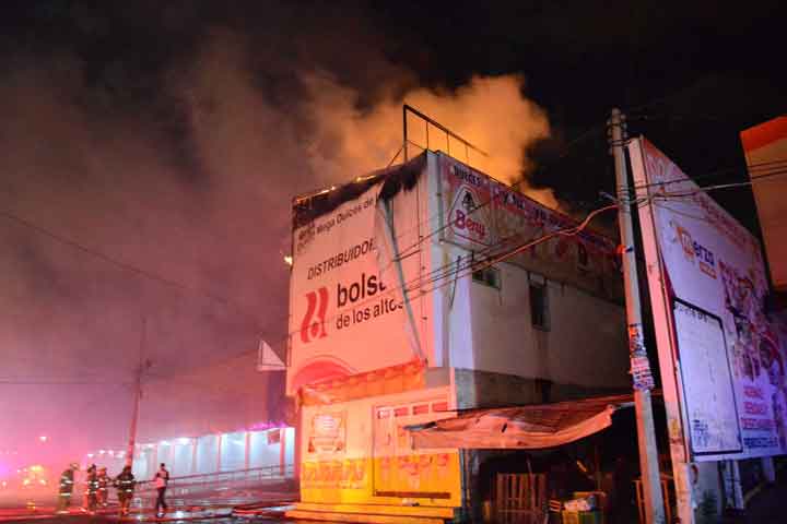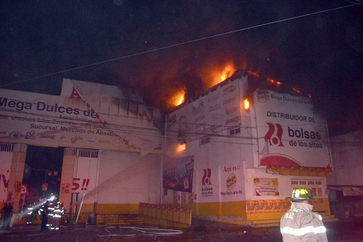 Un incendio carbonizó la segunda planta de la bodega de golosinas "Mega Dulces de Los Altos", ubicada en las calle Jitomate esquina Fresa, en el Mercado de Abastos.