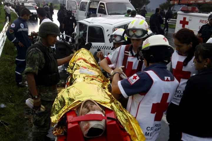 El conductor de un taxi quedó prensado contra el volante y gravemente herido, luego de que se impactó de frente contra una camioneta y quedó atrapado entre una mole de chatarra; de la otra unidad, se atendió al chofer y copiloto. El aparatoso accidente, cerca de ésta población cuando azotaba torrencial aguacero y feroz granizada.