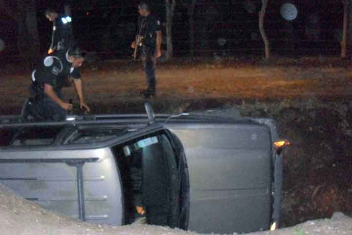Intensa movilización policíaca y de los cuerpos de auxilio se registró la madrugada de este martes, al suscitarse la volcadura de una camioneta que terminó por caer a un canal de riego, donde por fortuna el afluente no tenía corriente, pues una mujer quedó atrapada dentro de la unidad siniestrada, persona que resultó lesionada.